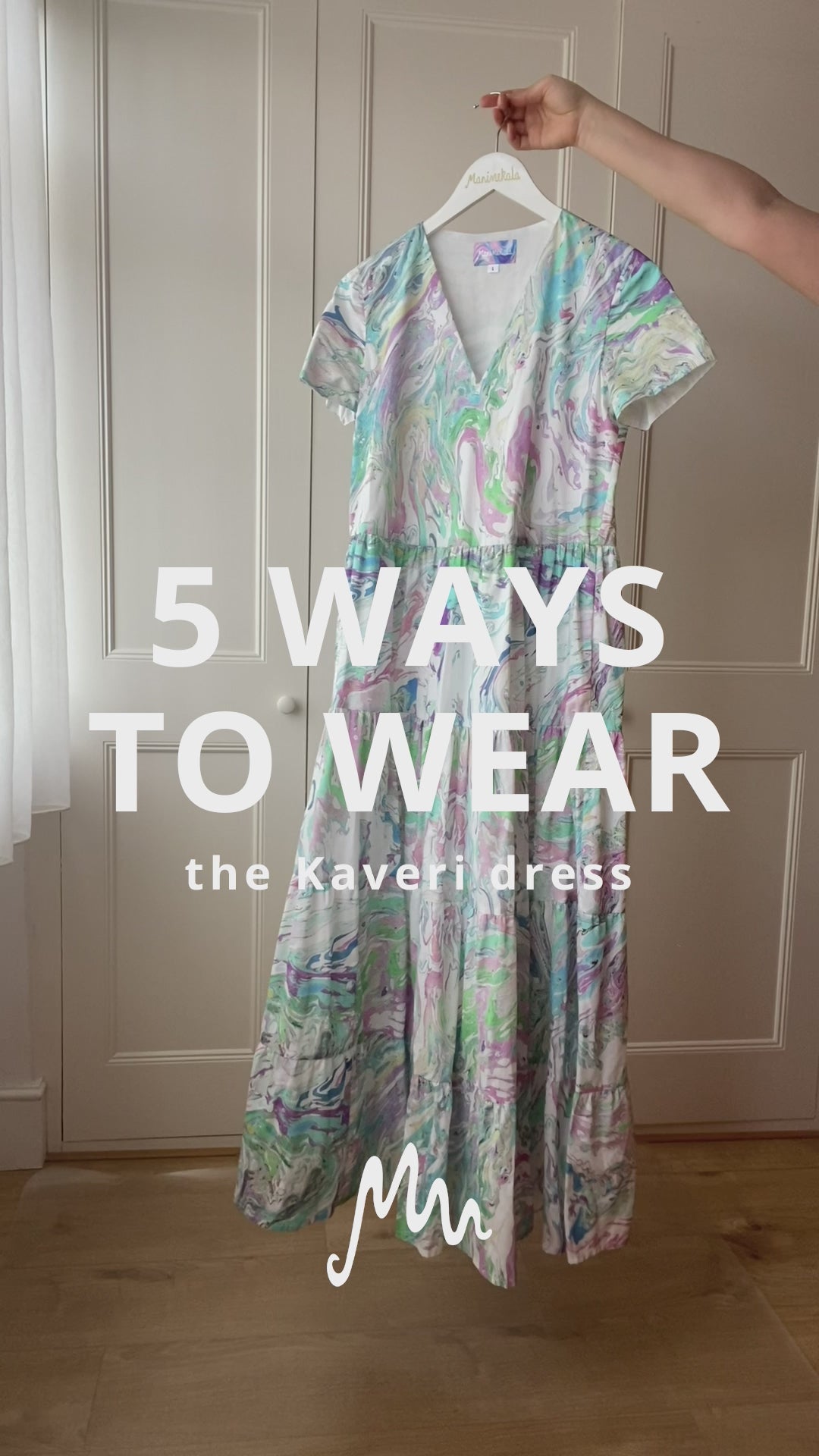 The Kaveri dress has an elegant maxi-length silhouette with V neck bodice, short sleeves, relaxed waist and fluid tiered skirt. Flowing effortlessly with every movement, she is crafted in lightweight organic cotton voile with our signature multicoloured pastel marbling printon soft white.